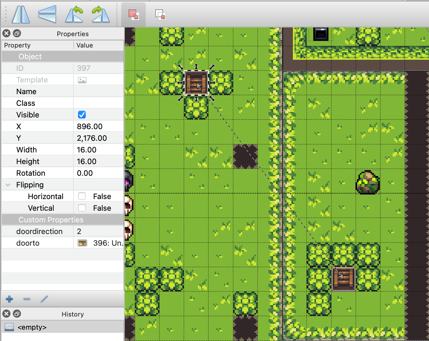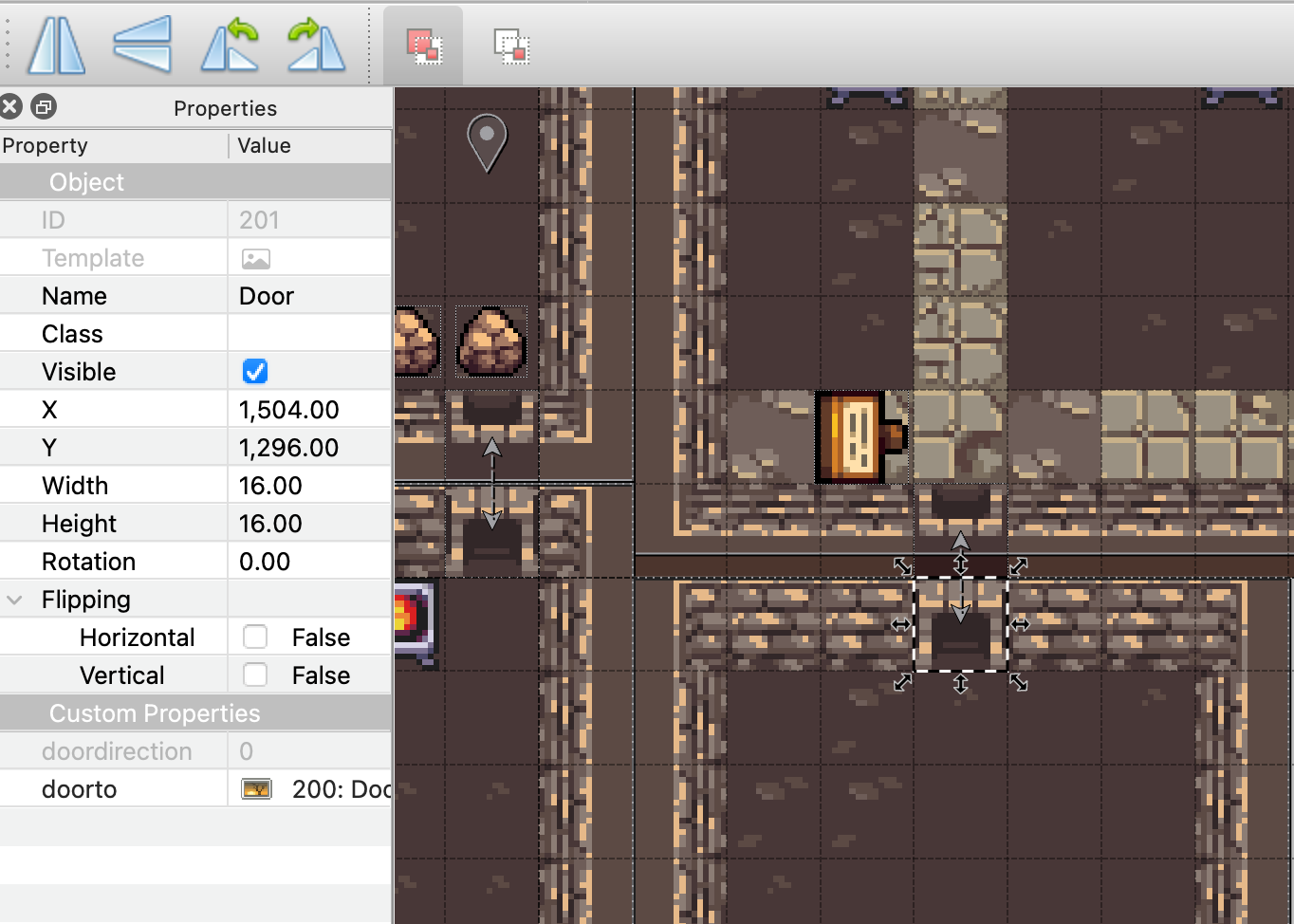 Making doors between rooms was one of the first and most complex tasks I had to do with Tiled. The way it works is that each door is an object that looks like a door facing in the appropriate direction. It’s important that there are no colliding tiles under the door so that the player can walk through it. Doors have two properties: doordirection and doorto.
